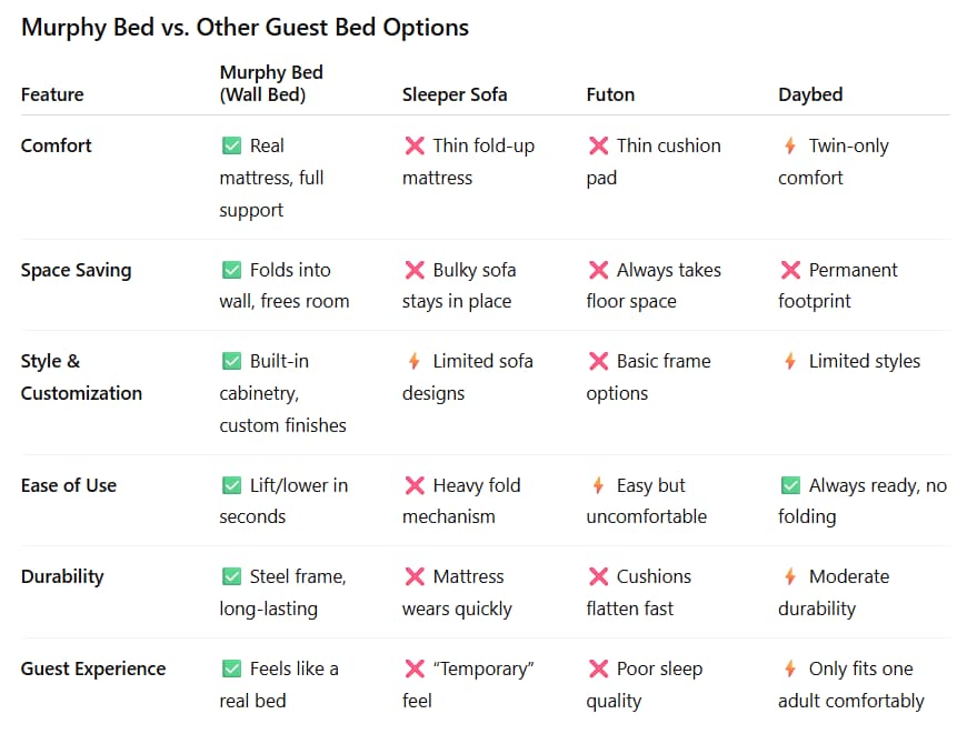 Murphy beds provide the comfort of a real mattress while freeing up space when not in use. Unlike sleeper sofas or futons, which use thin, folding mattresses that wear out quickly, Murphy beds support full-size mattresses for lasting comfort. Daybeds and sofa beds take up permanent floor space and rarely blend with your décor. A wall bed folds away seamlessly, giving you the flexibility of an open room by day and a comfortable bedroom by night—without compromise.